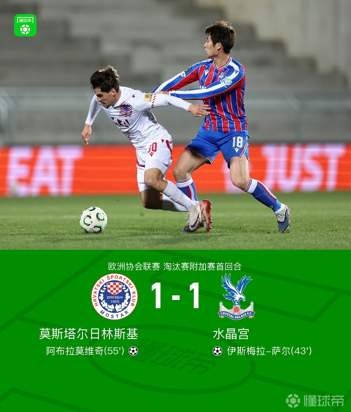 北京时间2月20日欧洲协会联赛 淘汰赛附加赛首回合,莫斯塔尔日林斯基对阵水晶宫。上半场,拉森做球,萨尔低射破门。下半场,米基奇助攻,阿布拉莫维奇扳平比分。全场比赛结束,水晶宫1-1战平莫斯塔尔日林斯基。